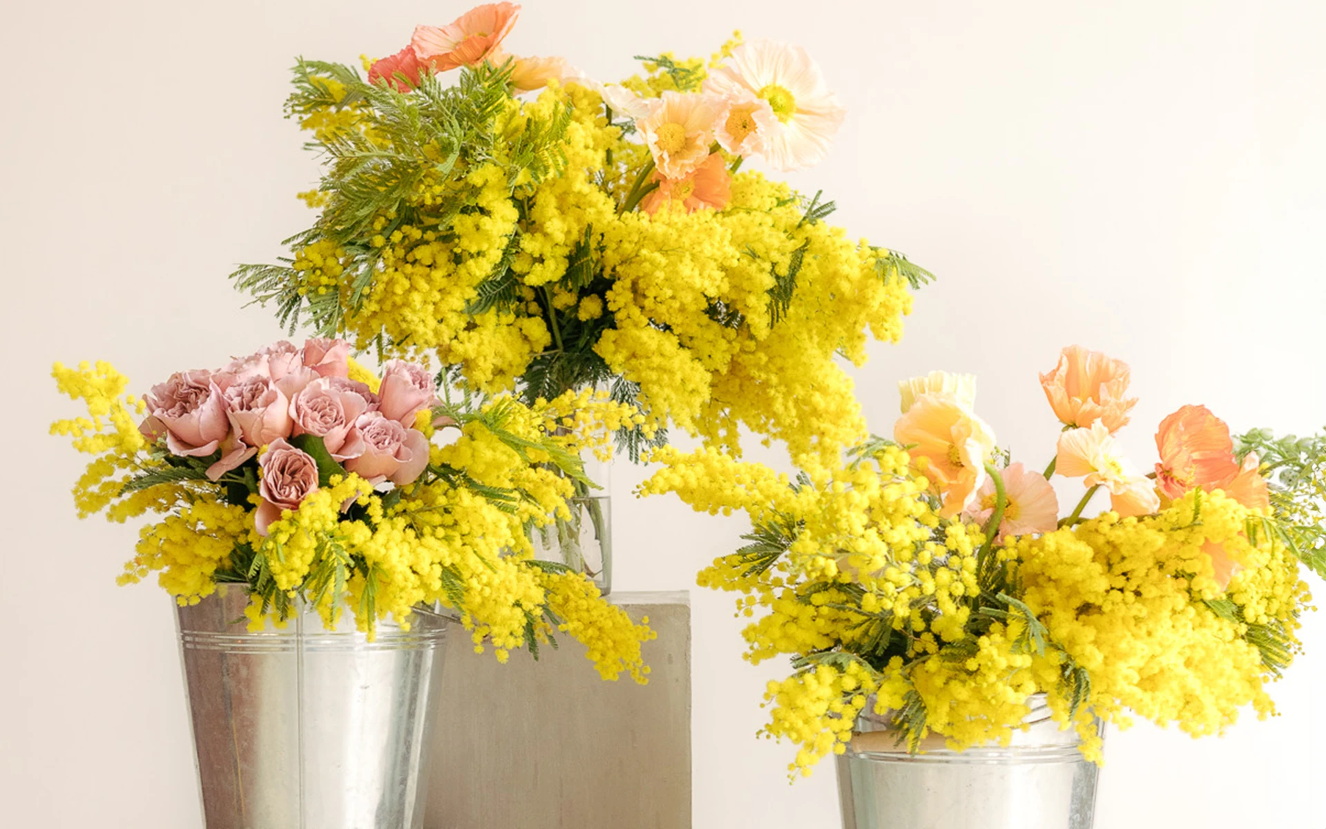 Composizione con mimose e fiori freschi di stagione disponibile in tre dimensioni.