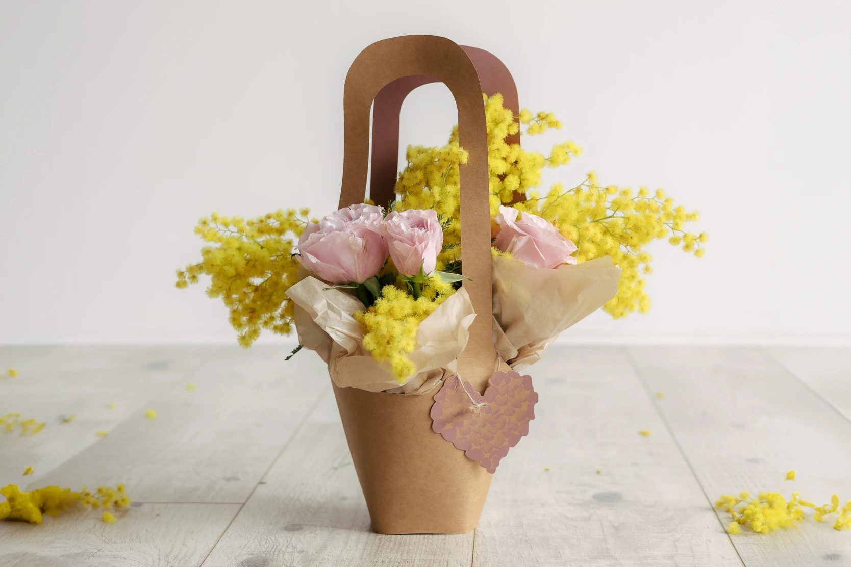 Composizione con mimose e fiori freschi di stagione disponibile in tre dimensioni.