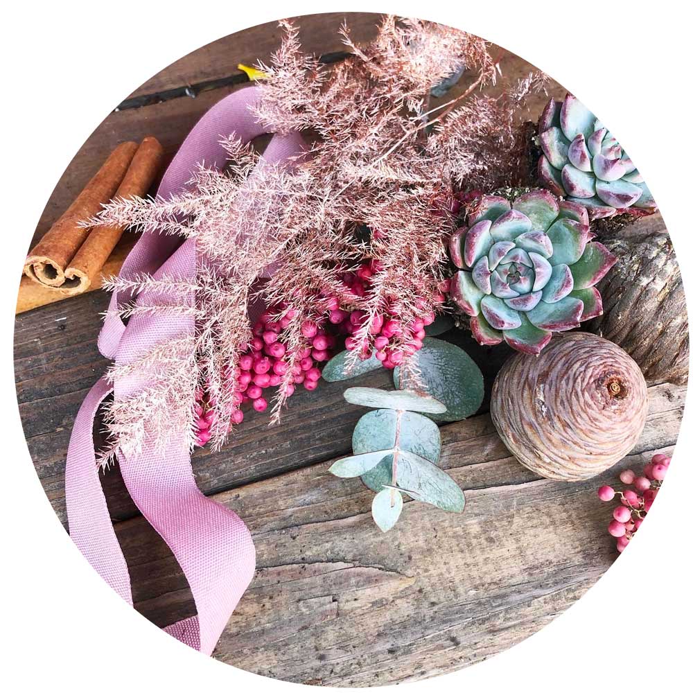 Un tocco di oro rosa per dare un tocco di magia, nastro in velluto rosa, con aggiunta di pepe rosa e echeverie
