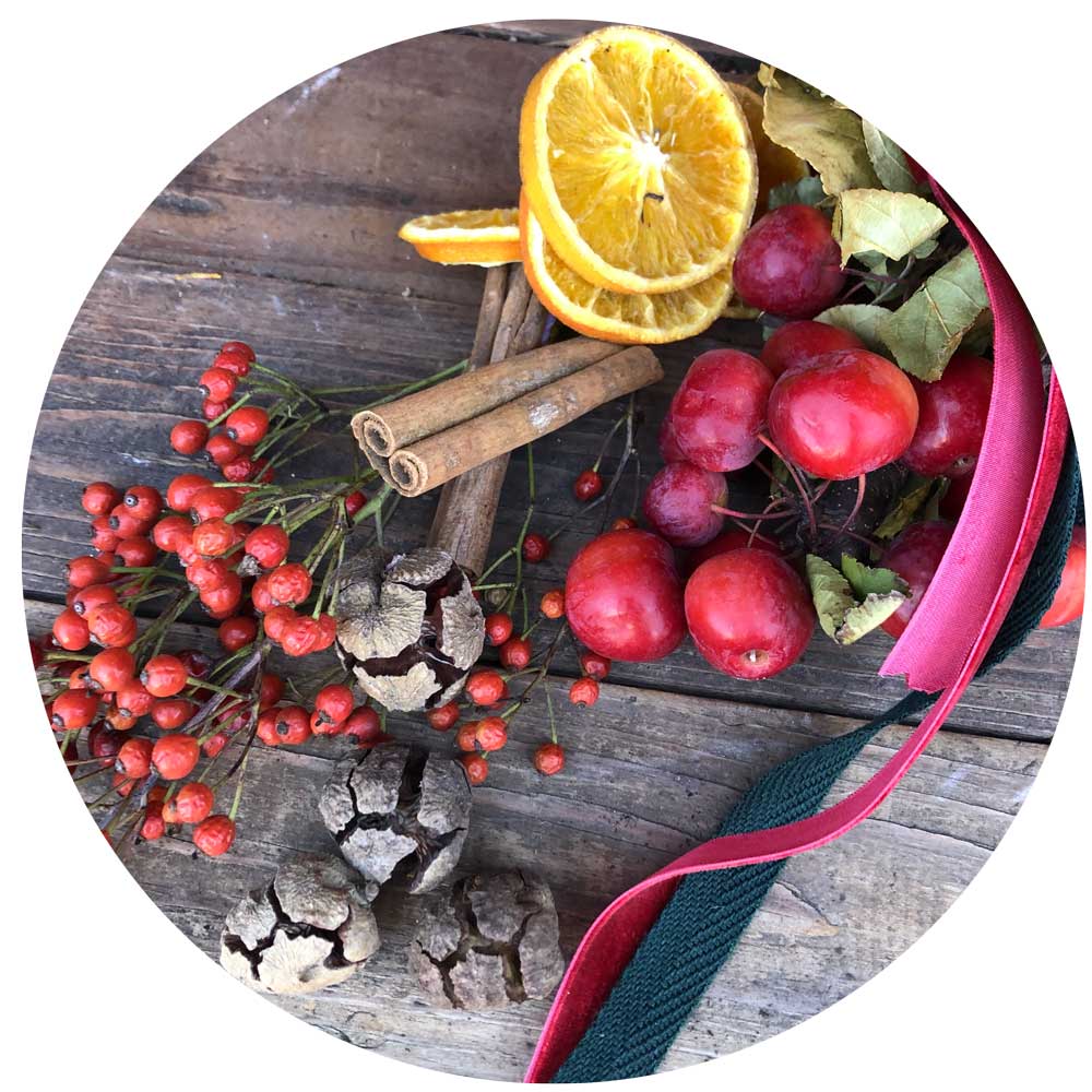 Al profumo di cannella e arancio, nastro in cotone rosso e verde, con aggiunta di frutti e bacche