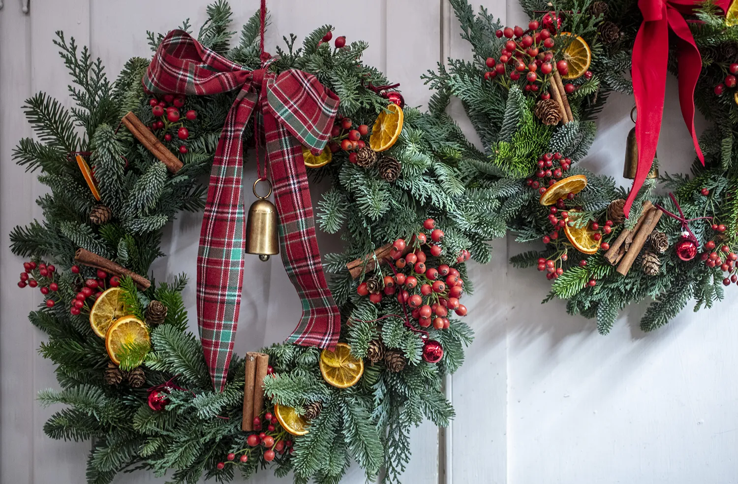 Al profumo di cannella e arancio, nastro in cotone rosso e verde, con aggiunta di frutti e bacche