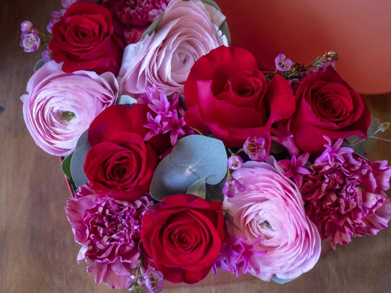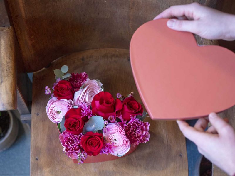 Scatola in cartone robusto a forma di cuore con composizione floreale mista, rose ranuncoli garofani. Edizione limitata fino ad esaurimento. Dimensione: 25cm